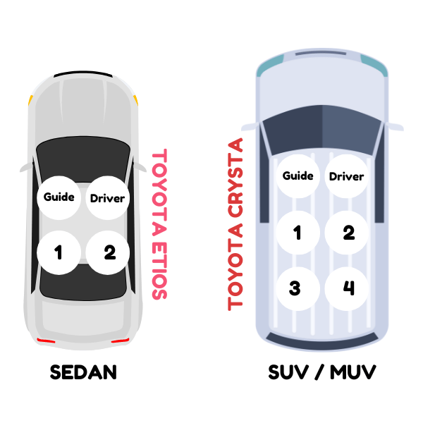 - Toyota Etios - INR 3050/- (Driver + 2 Pax + 1 Guide)